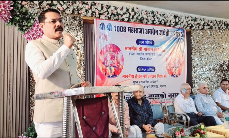 कोरबा // अग्रवाल सभा कटघोरा व बालकोनगर द्वारा बड़े हर्षोल्लास और धूमधाम के साथ श्री श्री 1008 महाराजा अग्रसेन जयंती समारोह का आयोजन किया गया। इस अवसर पर भारतीय जनता पार्टी जिला कोरबा के ऊर्जावान जिलाध्यक्ष आदरणीय श्री गोपाल मोदी जी मुख्य अतिथि के रूप में शामिल हुए, जहां अग्रवाल समाज के लोगों द्वारा श्री मोदी का आत्मीय रूप से स्वागत किया गया। इस समारोह मे श्री गोपाल मोदी ने महाराजा श्री अग्रसेन जी की प्रतिमा पर माल्याअर्पण और पूजन पश्चात कार्यक्रम का शुभारंभ किया गया। अग्रवाल सभा कटघोरा  द्वारा मुख्य अतिथि श्री गोपाल मोदी और विशिष्ट अतिथि श्री योगेश जैन का शाल श्रीफल भेंटकर सम्मानित किया गया। आयोजित किए गए विभिन्न प्रतियोगिता में प्रतिभागीयो को पुरस्कार का वितरण किया गया।समारोह में उपस्थित अतिथियों ने महाराजा अग्रसेन जी के आदर्शों, सिद्धांतों और त्याग-बलिदान की परंपरा पर प्रकाश डाला। समाज में एकता, सहयोग और सेवा भाव को जीवन का मूलमंत्र बताते हुए सभी ने अग्रसेन जी को युगपुरुष करार दिया।