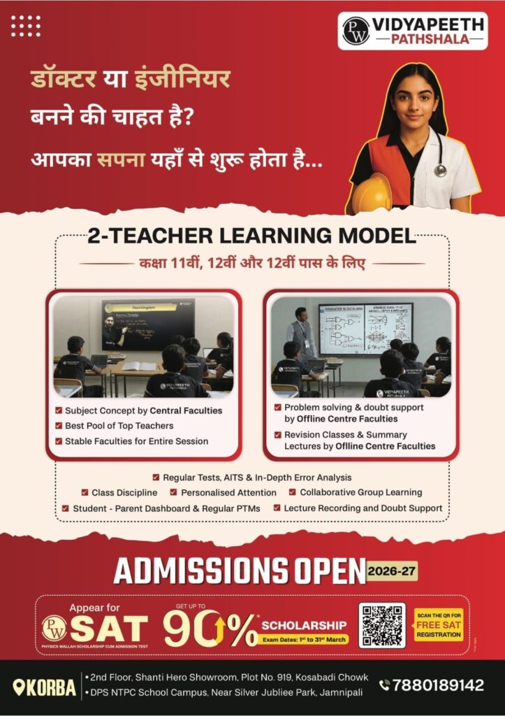 कोरबा : औद्योगिक नगरी कोरबा अब शिक्षा के क्षेत्र में भी तेजी से उभर रहा है। देश के चर्चित एडटेक प्लेटफॉर्म Physics Wallah ने अपने विद्यापीठ पाठशाला, कोरबा केंद्र के माध्यम से Academic Session 2026–27 के लिए एडमिशन प्रक्रिया शुरू कर दी है। इस पहल से अब स्थानीय छात्रों को बेहतर शिक्षा के लिए बड़े शहरों पर निर्भर नहीं रहना पड़ेगा।