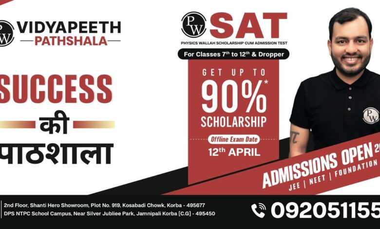 कोरबा छत्तीसगढ़ // शहर के विद्यार्थियों के लिए एक बड़ा शैक्षणिक अवसर सामने आया है। *Physics Wallah Vidyapeeth Pathshala, Korba* द्वारा आगामी *12 अप्रैल* को *Mega Offline Scholarship Test (SAT)* आयोजित किया जा रहा है, जिसके माध्यम से छात्रों को *90% तक स्कॉलरशिप* प्राप्त करने का सुनहरा मौका मिलेगा। यह परीक्षा विशेष रूप से कक्षा 8वीं से 12वीं तक के विद्यार्थियों तथा JEE/NEET की तैयारी कर रहे छात्रों के लिए रखी गई है, ताकि उन्हें कम शुल्क में बेहतर गुणवत्ता वाली ऑफलाइन कोचिंग उपलब्ध कराई जा सके।