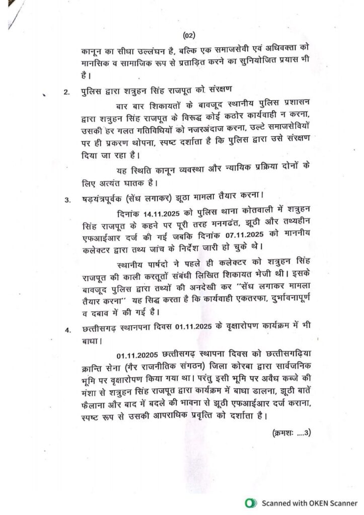 शिकायत के अनुसार 14 नवंबर 2025 को थाना कोतवाली में शत्रुहन सिंह राजपूत के कहने पर तथ्यहीन एफआईआर दर्ज कर दी गई, जबकि 07 नवंबर 2025 को कलेक्टर द्वारा मामले की तथ्य-जांच के निर्देश जारी हो चुके थे। स्थानीय पार्षदों द्वारा आरोपी की गतिविधियों की पूर्व शिकायतें भी पुलिस द्वारा अनदेखी की गईं।