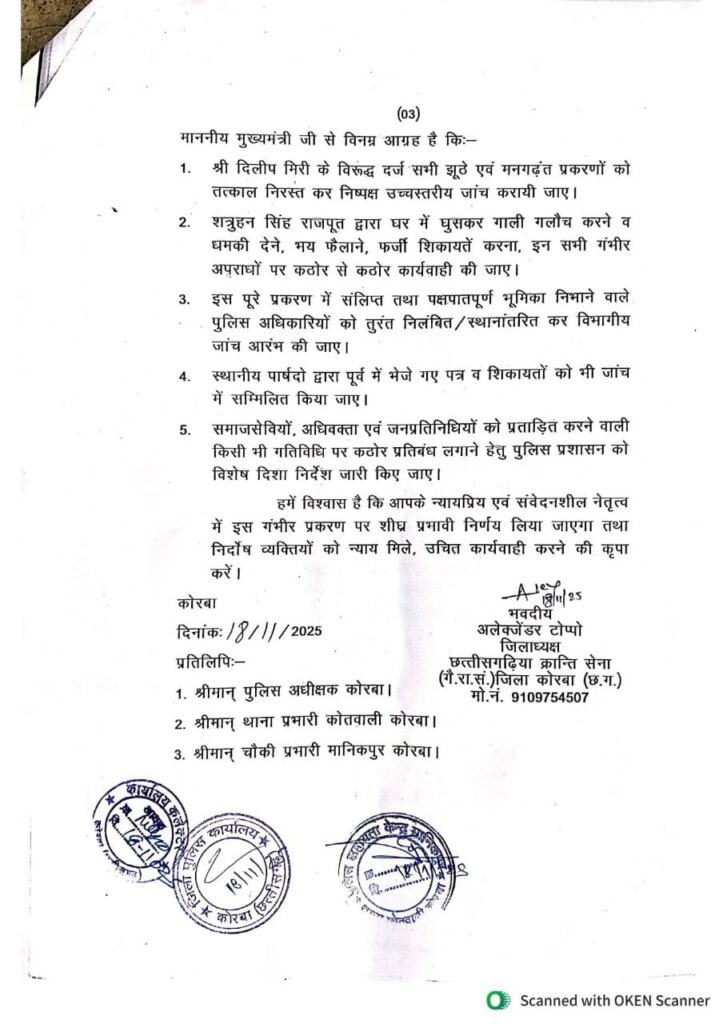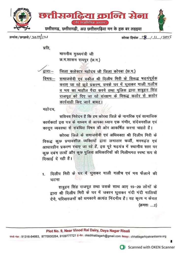 कोरबा। समाजसेवी एवं अधिवक्ता दिलीप मिरी के विरुद्ध लगातार झूठे, मनगढ़ंत और आधारहीन प्रकरण दर्ज किए जाने के विरोध में छत्तीसगढ़िया क्रांति सेना (गैर राजनीतिक संगठन) ने मुख्यमंत्री छत्तीसगढ़ शासन को एक विस्तृत शिकायत भेजी है। संगठन ने इसे कानून व्यवस्था के लिए गंभीर खतरा बताते हुए उच्चस्तरीय जांच की मांग की है।