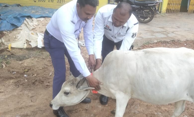 बरसात समय पर घुमंतू गाय, बैल, बछड़ा अधिकांश रोड में ही रहते हैं, जिसे वाहन एक्सीडेंट होने का खतरा बना रहता है, जिसको दृष्टिगत रखते हुए, उचित बचाव के लिए *अतिरिक्त पुलिस अधीक्षक यातायात श्री उदयन बेहार* के नेतृत्व में जिले के हाइवे रोड/मुख्यालय जांजगीर के रोड पर घुमंतु गाय/बैल, बछड़ों को पकड़कर उनके गले में सुरक्षार्थ रेडियम पट्टी लगाया जा रहा है। जिससे रात्रि में रेडियम पट्टी पर प्रकाश पड़ने पर वाहन दुर्घटनाओं से बची जा सकें।