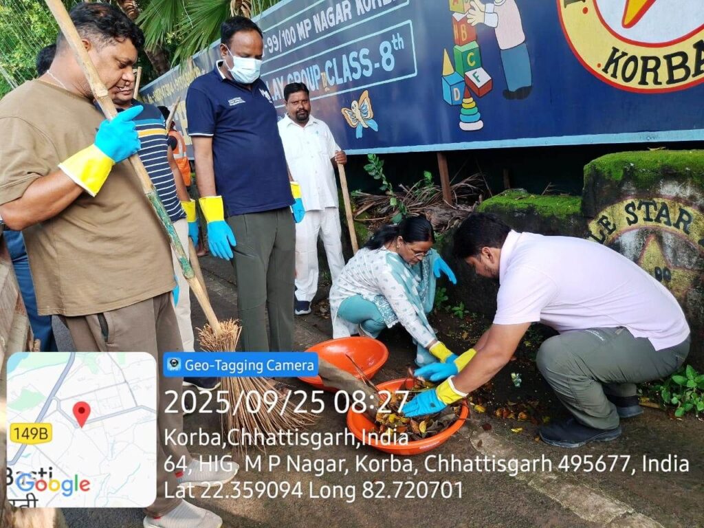 कोरबा छत्तीसगढ़ // स्वच्छता ही सेवा-2025 अभियान अंतर्गत आज घंटाघर से रविशंकर नगर की ओर जाने वाले मुख्य मार्ग एवं वहॉं पर स्थित उद्यान में नगर पालिक निगम कोरबा द्वारा स्वच्छता अभियान संचालित किया गया। महापौर श्रीमती संजूदेवी राजपूत आयुक्त श्री आशुतोष पाण्डेय, सभापति श्री नूतन सिंह ठाकुर सहित पार्षदों, जनप्रतिनिधियों व अधिकारी कर्मचारियों ने स्वच्छता हेतु श्रमदान किया तथा साफ-सफाई का कार्य में अपनी सहभागिता दी।