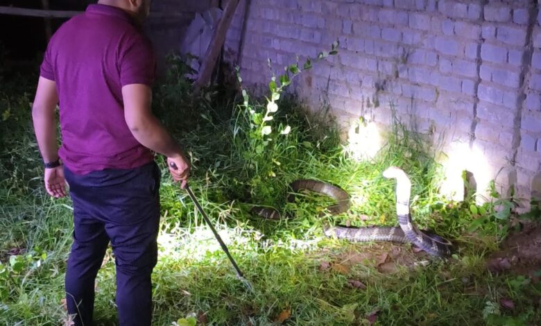 घर के आंगन में बैठा विशाल काय किंग कोबरा, कोरबा वन मण्डल के मार्गदर्शन में जितेंद्र सारथी ने किया गया सफल रेस्क्यु…