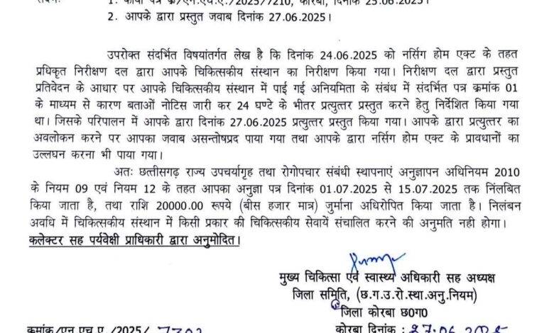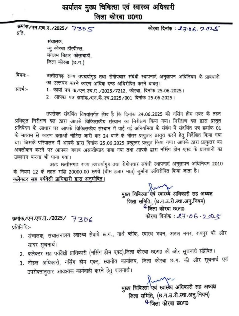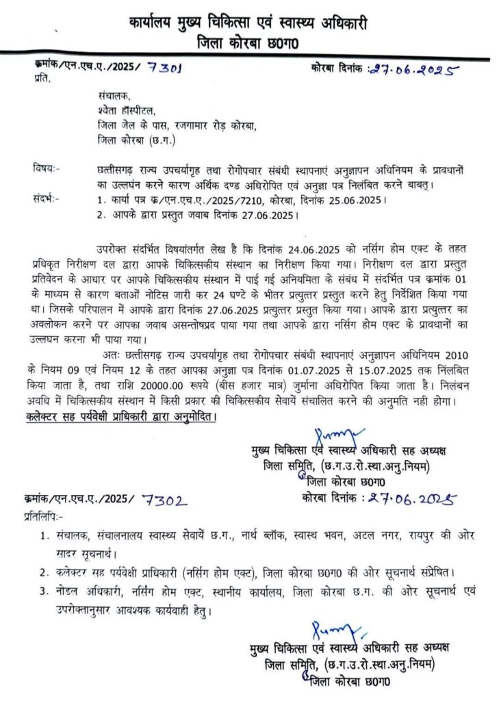 न्यू कोरबा हॉस्पिटल और श्वेता हॉस्पिटल को लगा जुर्माना, श्वेता हॉस्पिटल का लाइसेंस 15 दिन के लिए निलंबित… देखें आदेश