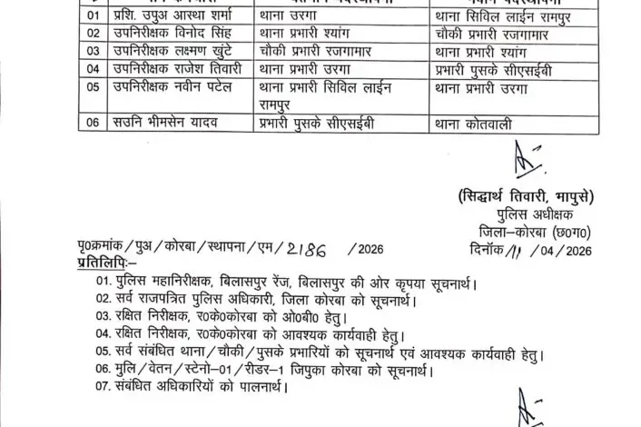 कोरबा छत्तीसगढ़ // जिले के एसपी सिद्धार्थ तिवारी ने एक बड़ी फेरबदल करते हुए कई थाना और चौकियों के प्रभारियों को बदल दिया है, जिसे लेकर जारी आदेश में थाना प्रभारी और चौकी प्रभारियों के नाम शामिल हैं।