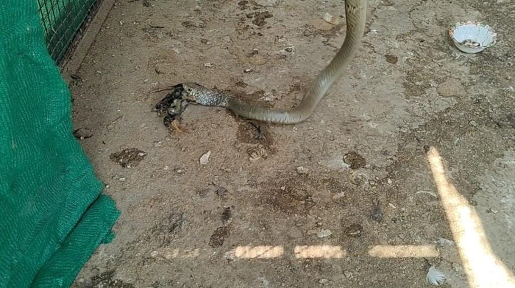 कोरबा छत्तीसगढ़ // कोरबा जिला के रिश्दी क्षेत्र में डॉ. शतदल नाथ के फार्म हाउस में उस समय अफरा तफरी मच गई जब सुबह देख रेख करने वाला व्यक्ति मुर्गियों को दाना देने गया तब मुर्गी के बाड़े में घुसे सांप को चूज़े को खाते हुए देखा डरा सहमा व्यक्ति डर से बाहर भाग खड़ा हुआ फिर डॉ. शतदल नाथ को जानकारी होते ही तत्काल वाइल्डलाइफ रेस्क्यु टीम प्रमुख जितेंद्र सारथी को दिया जिस पर थोड़ी देर में पहुंचने की बात कही फिर कुछ देर बाद अपने टीम के सदस्य साहिल के साथ पहुंचे और बड़ी सावधानी से 8 फीट लंबे धमना सांप को रेस्क्यु कर बाड़े से बाहर निकाला गया , उसी वक्त शिकार किए हुए 3 मुर्गी के बच्चों को उगल दिया फिर आखिकार सांप को थैले में डाला गया तब जाकर सभी ने राहत भरी सांस लिया फिर सांप को उसके प्राकृतिक रहवास जंगल में छोड़ दिया गया।