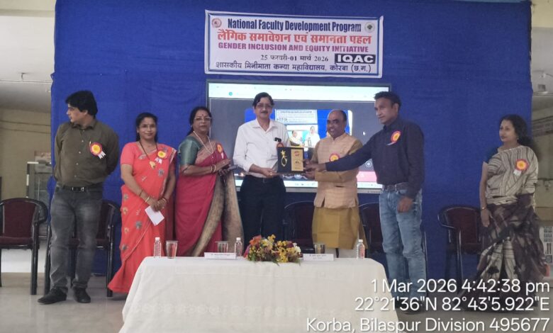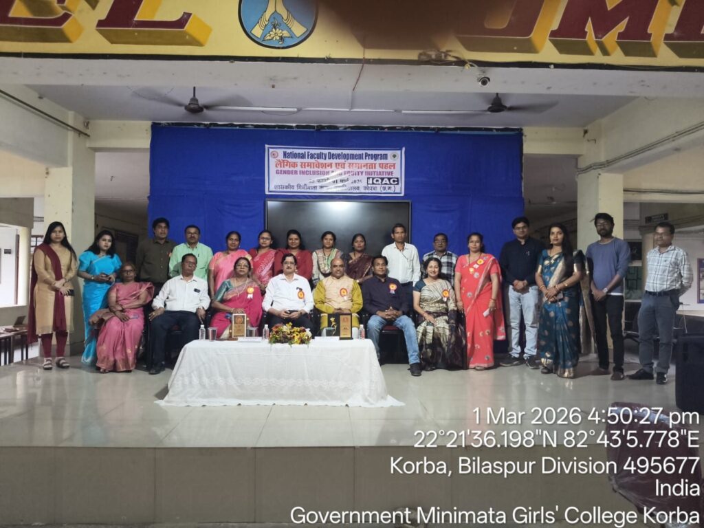 कोरबा छत्तीसगढ़ // शासकीय मिनीमाता कन्या महाविद्यालय में दिनांक 25 फरवरी से 01 मार्च 2026 तक राष्ट्रीय उच्चतर शिक्षा अभियान के तहत् पाँच दिवसीय फैकल्टी डेवलपमेंट प्रोग्राम शीर्षक ‘लैंगिक समावेशन एवं समानता पहल’ का आयोजन किया गया। कार्यक्रम का उद्देश्य शिक्षकों एवं शिक्षाविदों को लैंगिक संवेदनशीलता समान अवसर एवं समावेशी शिक्षण पद्धति के प्रति जागरूक एवं प्रशिक्षित करना था।