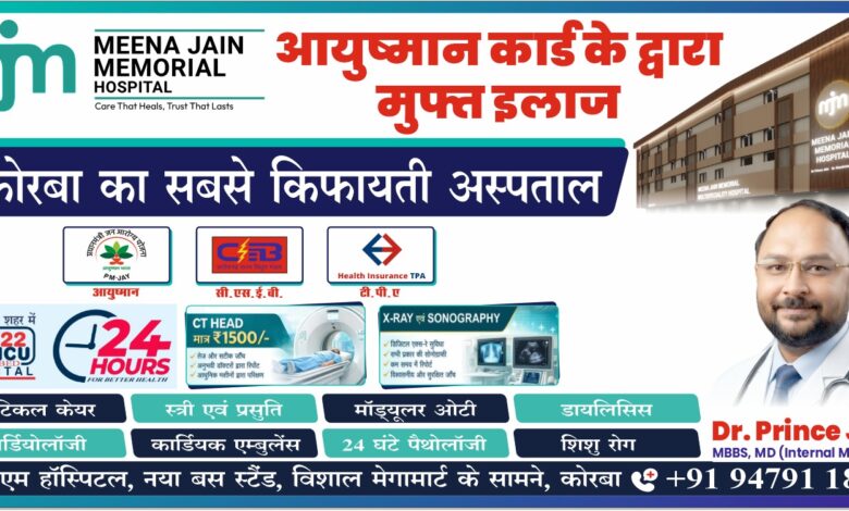 कोरबा। शहर में सस्ती और बेहतर स्वास्थ्य सेवाओं की तलाश अब खत्म होती नजर आ रही है। मीना जैन मेमोरियल (एमजेएम) हॉस्पिटल ने खुद को न सिर्फ किफायती बल्कि पूरी तरह कैशलेस इलाज केंद्र के रूप में स्थापित कर लिया है। अब आयुष्मान कार्ड और विभिन्न हेल्थ इंश्योरेंस योजनाओं के माध्यम से मरीजों को न्यूरो, मेडिसिन, स्त्री रोग सहित कई गंभीर बीमारियों का इलाज निःशुल्क मिल रहा है।