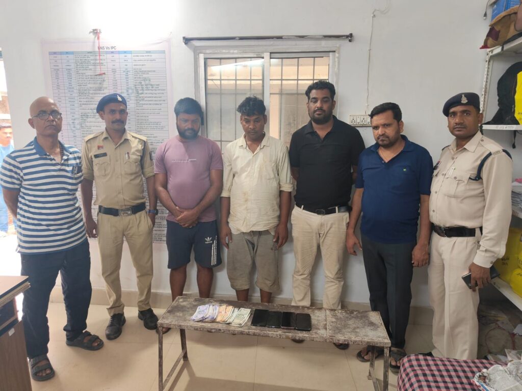 सक्ती छत्तीसगढ़ // पुलिस अधीक्षक अंकिता शर्मा द्वारा अवैध जुआ/सट्टा तथा नशे के कारोबारियों के विरूद्ध विशेष अभियान चलाकर प्रभावी कार्यवाही करने के दिये गये दिशा निर्देशों के परिपालन में अतिरिक्त पुलिस अधीक्षक हरिश यादव एवं अनुविभागीय अधिकारी(पुलिस) मनीष कुंवर के मार्गदशन में सक्रिय मुखबिर तैनात कर सूचना संकलन किया जा रहा था कि दिनांक 02.09.2025 को मुखबीर सूचना मिला कि ग्राम सकरेली कला नर्सरी खार में कुछ जुआड़ियान तासपत्ती से रूपये पैसों का दांव लगाकर जुआ खेल रहे है कि सूचना पर हमराह स्टाफ के गवाहान के उपस्थिति में विधिवत रेड कार्यवाही किया गया जो कुछ जुआड़ियान पुलिस को देखकर भाग गये तथा मौके पर 01 विकास कृपलानी पिता पुरूषोत्तम कृपलानी उम्र 39 वर्ष साकिन आफिसर कालोनी सक्ती, 02. रविशंकर अग्रवाल पिता स्व0 गोर्वधन अग्रवाल उम्र 36 वर्ष साकिन पुराना स्टैट बैंक पीछे सक्ती, 03. दिलीप कुमार चंद्रा पिता केशव प्रसाद उम्र 37 वर्ष साकिन ग्राम सकर्रा थाना मालखरौदा जिला सक्ती एवं 04. जोगीराम रात्रे पिता दाउराम रात्रे उम्र 40 वर्ष साकिन ग्राम सकर्रा थाना मालखरौदा जिला सक्ती जुआ खेलते रंगेहाथ पकड़े गये। जिसे फड़ एवं पास से नगदी रकम 21300 रूपये, 04 नग विभिन्न कंपनी का मोबाईल कीमती 100000रूपये तथा 09 नग मोटरसायकल कीमती 7,20,000 रूपये, कुल जुमला कीमती 8,41,300रूप्ये को जप्त कर कब्जा पुलिस लिया गया है। आरोपीगण का कृत्य धारा 3(2) छत्तीसगढ़ जुआ प्रतिषेध अधिनियम 2022 का घटित करना पाये जाने से गिर0 कर विधिवत कार्यवाही किया गया है।इस प्रकरण में शामिल रहे अन्य आरोपियों की भी मामले में पतासाजी की जा रही है।