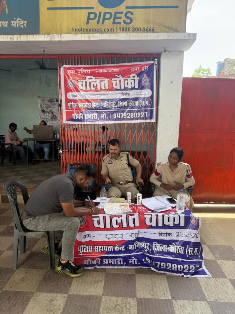 कोरबा छत्तीसगढ़ // पुलिस अधीक्षक, जिला कोरबा के निर्देशन एवं अतिरिक्त पुलिस अधीक्षक तथा नगर पुलिस अधीक्षक के मार्गदर्शन में दिनांक 23.04.2026 को पुलिस सहायता केंद्र मणिकपुर क्षेत्रांतर्गत दादर में “चलित थाना” का सफल आयोजन किया गया।यह अभिनव पहल आम नागरिकों को त्वरित, सुलभ एवं प्रभावी पुलिस सेवा प्रदान करने के उद्देश्य से की गई, जिसके अंतर्गत पुलिस टीम सीधे आमजन के बीच पहुँची।आयोजन स्थल पर अस्थायी पुलिस सहायता केंद्र स्थापित कर नागरिकों की शिकायतें दर्ज की गईं एवं उनकी समस्याओं को गंभीरता से सुना गया।