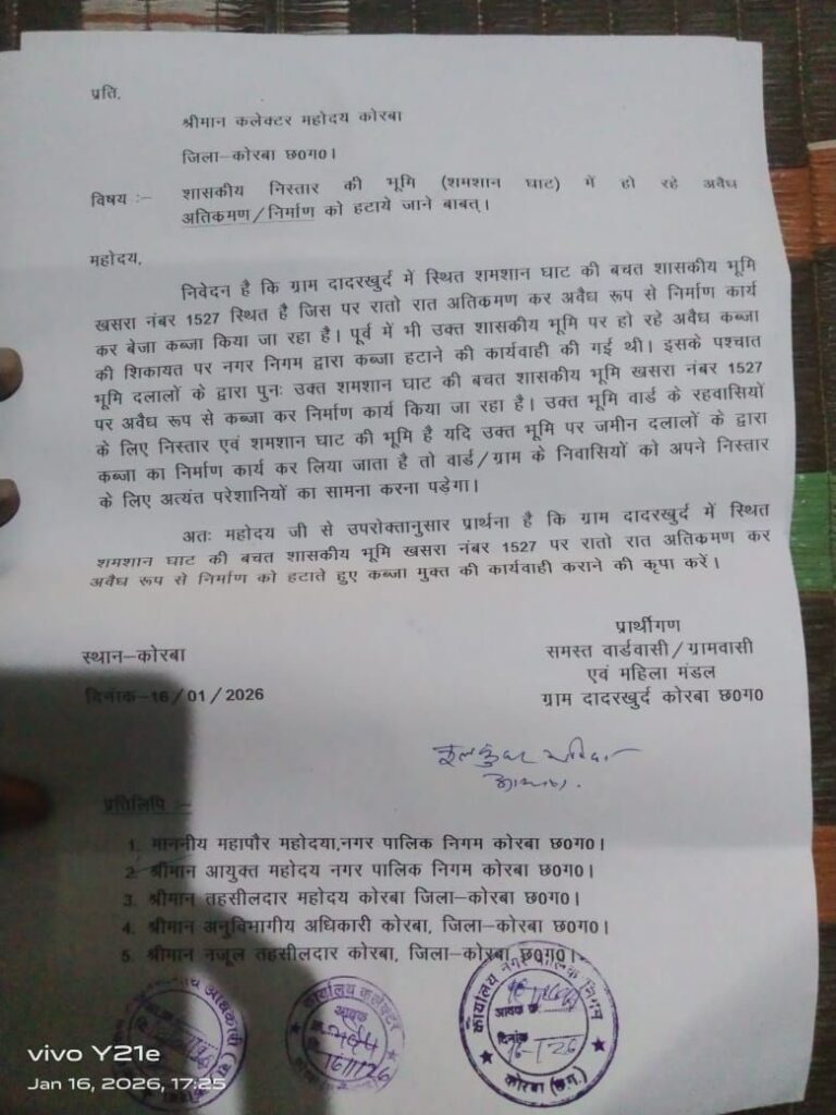 कोरबा छत्तीसगढ़ // ग्राम दादर खुर्द में स्थित श्मशान घाट की बचत शासकीय भूमि खसरा नंबर 1527 को जमीन दलालों के द्वारा रातों रात अतिक्रमण कर अवैध रूप से निर्माण कार्य कर बेजा कब्जा करने का मामला सामने आया है। इसको लेकर दादर खुर्द के लोगों ने शुक्रवार को एसडीएम,तहसीलदार, नगर निगम आयुक्त और महापौर को ज्ञापन दिया है।