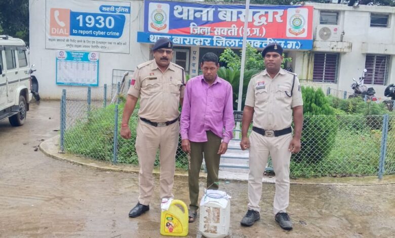 सक्ती थाना – बाराद्वार / पुलिस अधीक्षक सक्ती अंकिता शर्मा द्वारा क्षेत्र मे अवैध जुआ, गांजा व शराब बिक्री एवं परिवहन करने वाले आपराधियों पर अकुंश लगाने हेतु अधिक अधिक कार्यवाही करने की निर्देश पर अतिरिक्त पुलिस अधीक्षक हरीश यादव, अनुविभागीय अधिकारी (पुलिस) मनीष कुंवर सक्ती के मार्गदशन पर थाना प्रभारी निरीक्षक लखन पटेल थाना बाराद्वार द्वारा दिनांक 05.07.25 को मुखबीर की सुचना पर ग्राम दर्राभाटा में टीम बनाकर रेड कार्यवाही कर आरोपी. राजू खांडे पिता कुरु खांडे उम्र 40 साल निवासी दर्राभाटा थाना बाराद्वार, जिला सक्ती(छग) के कब्जे से कुल 20 लीटर कच्ची महुआ शराब भरी हुई कीमति 2000/- रूपये को जप्त किया गया जिसे आबकारी एक्ट के प्रावधानो के तहत विधिवत कार्यवाही कर आबकारी अधिनियम का सबुत पाये जाने से आरोेपी को गिरफ्तार कर रिमांड पर मान.न्यायालय पेश किया गया।